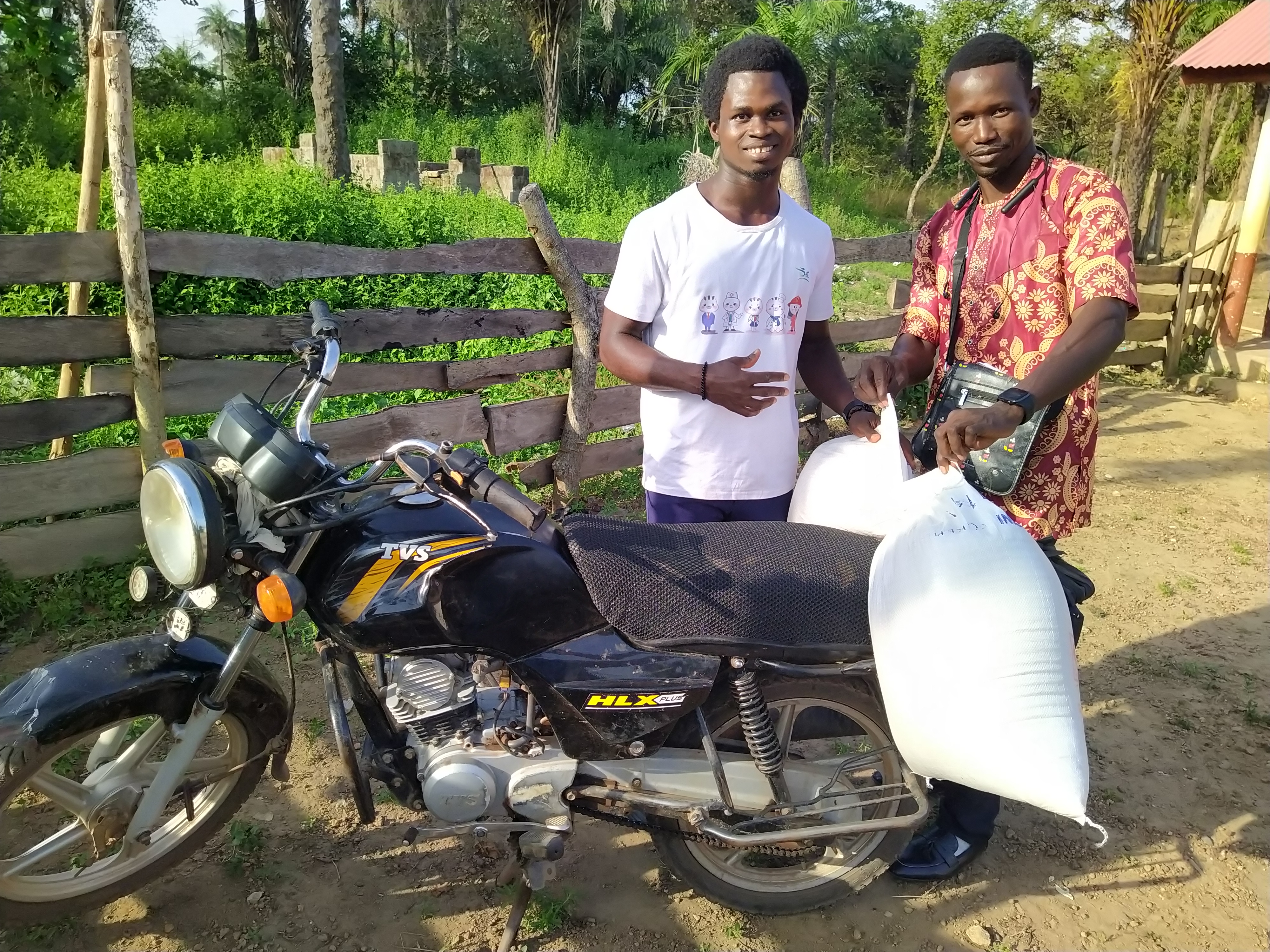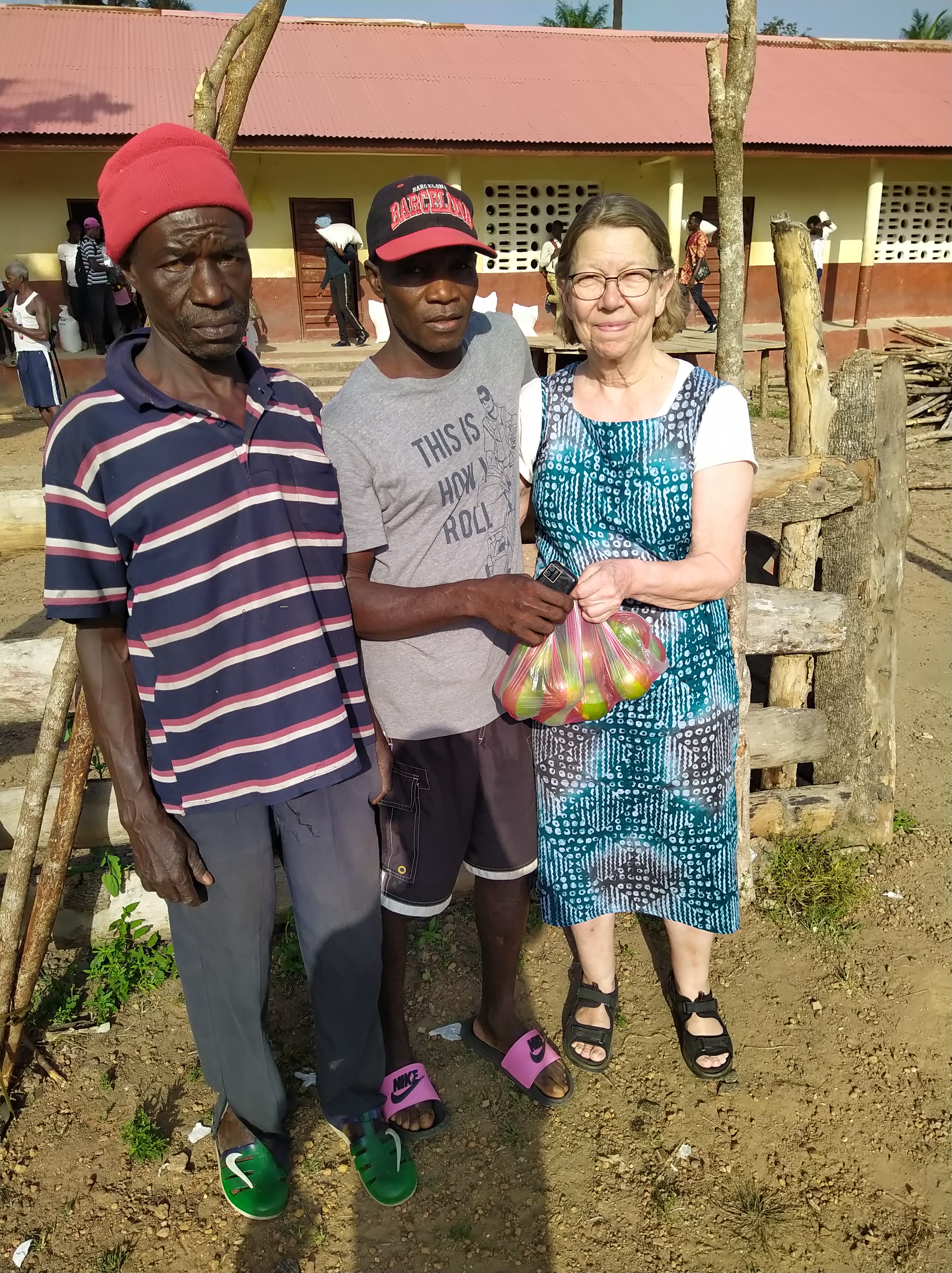 Sain kotini kuntoon, mutta kaikkia ystäviäni en ole vielä ehtinyt tapaamaan. Nyt jo odotan joulutaukoa, koska ensin tein kovasti valmisteluja ja sitten pidimme ensimmäisen opepajan. Palkattomille opettajille jaetut riisit pajan lopussa olivat heille tuiki tarpeen. Useiden perheiden ateriat ovat kutistuneet yhteen ateriaan päivässä, eikä siinäkään usein ole muuta kuin riisiä. Hintojen nousu on aiheuttanut maassa kapinaakin. Pidimme pajaa kaksi päivää Masiban kylässä huonon tien takana ja sen jälkeen Gbendembun keskustassa. Sain itsekin kyläpäälliköltä lahjan, pussillisen appelsiineja. Taustalla opettajat pakkailevat riisejään.