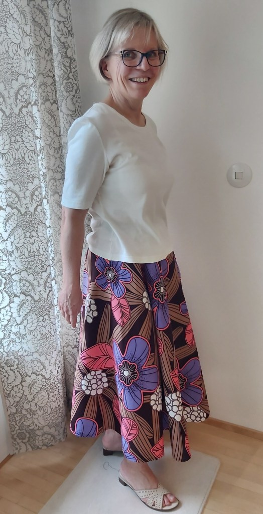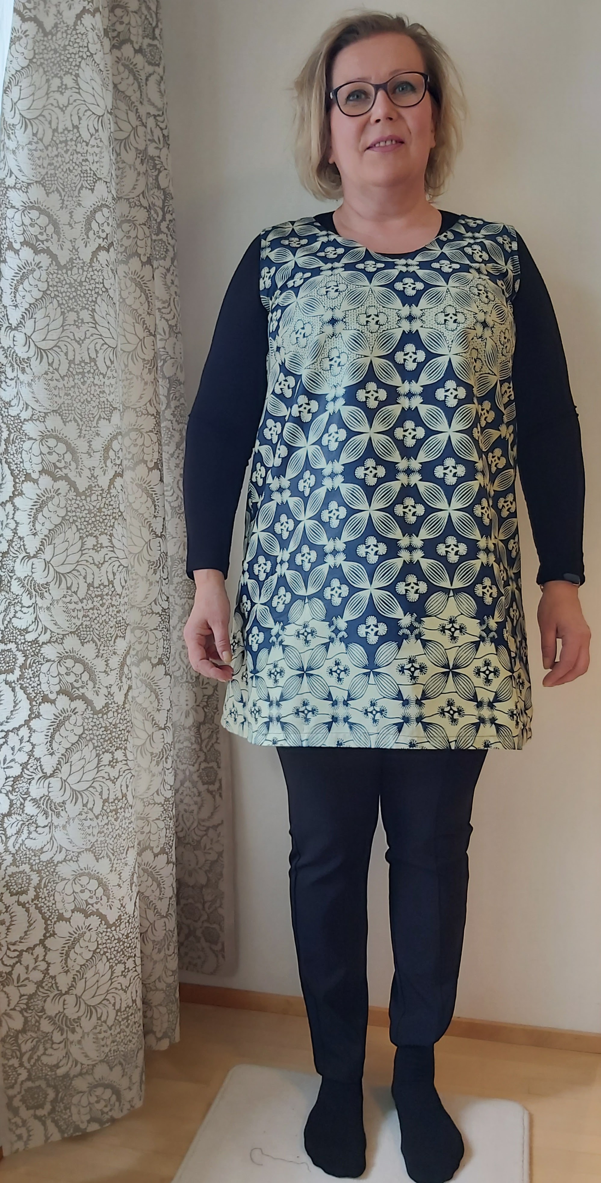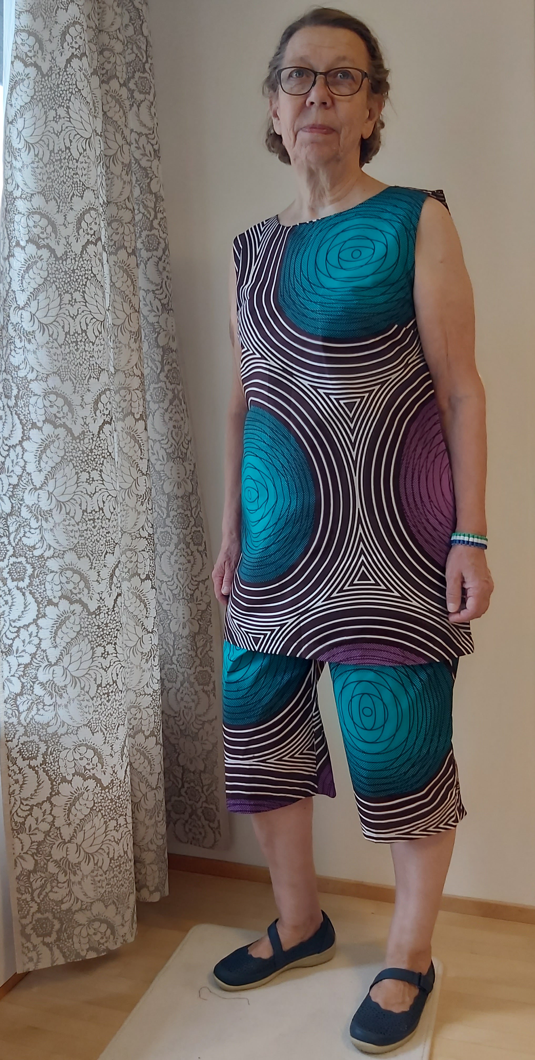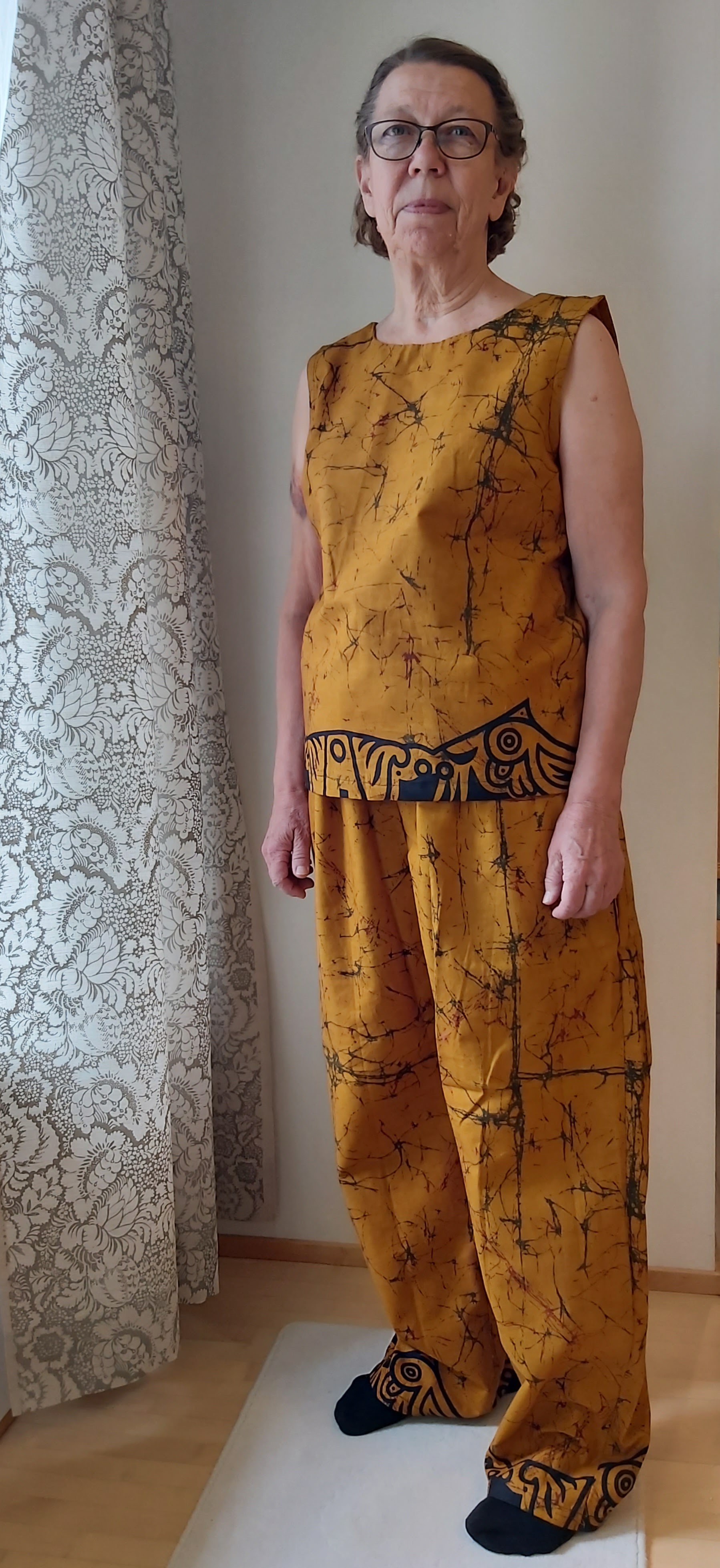 Vaatteita ja pussukoita on valmistettu kaikkiaan 13 erilaisesta kuosista. Osa housuista ja topeista osoittautui sovitettaessa selvästi kaavaa suuremmaksi, mutta koot on vielä erikseen tarkistettu myyntiä varten. Olen sopinut suunnittelijan kanssa, että tarvittaessa voimme tehdä vaatteisiin pieniä muutoksia – esimerkiksi lyhentää housun puntteja.