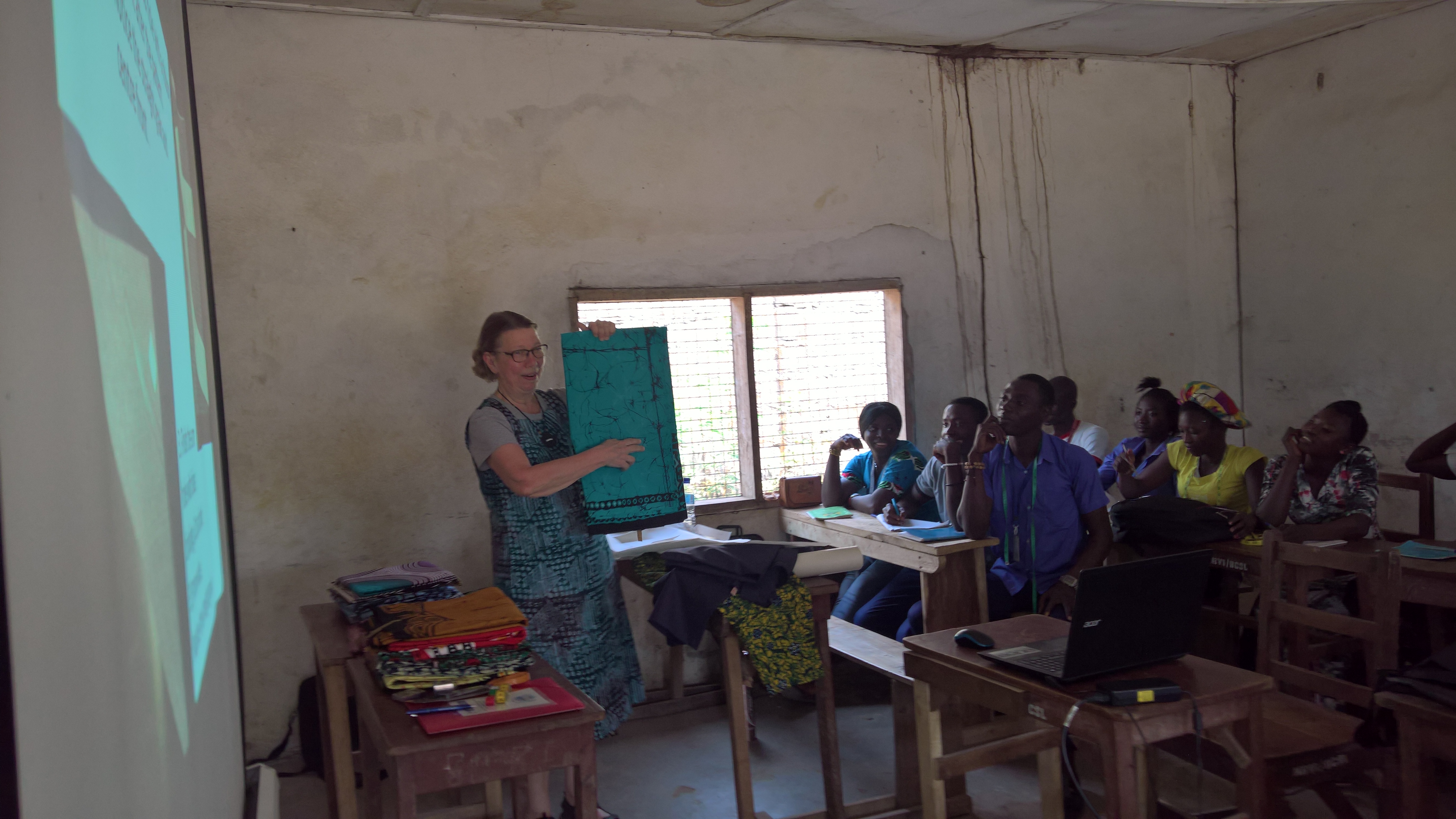 Tuumasta toimeen! Suomalainen ystäväni – ammattikoulun tekstiilityön opettaja –suunnitteli toimivat kaavat ja laati ompeluohjeet. Kankaat ostin Freetownin kaduilta. Helmikuun lopulle päivätyssä blogissani kerroinkin jo käsityöpajasta, jossa ohjeistin makamalaisopiskelijoita vaatteitten tekoon.
